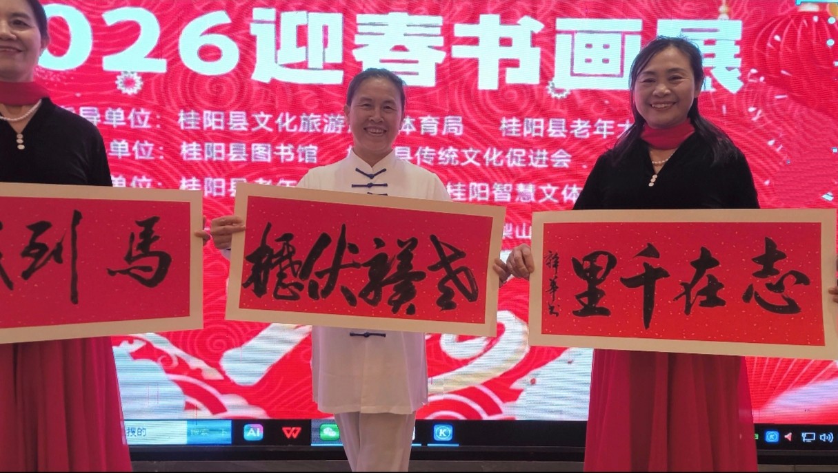 2026年1月9日,桂阳县图书馆与县传统文化促进会在夜宿梨山红色文化教育基地梨山庭院联合举办为期30天的“骏马迎春,翰墨贺岁”迎新春书画展启动。活动共展出本土书法家、书画爱好者创作的168幅作品,开展当天吸引1790余人参观。
