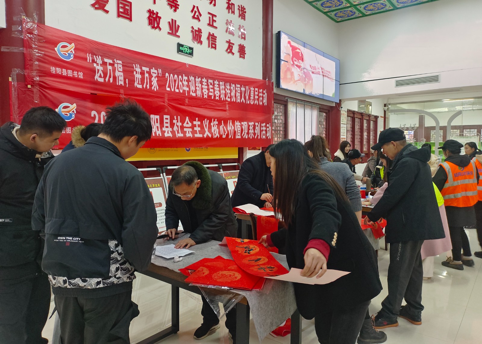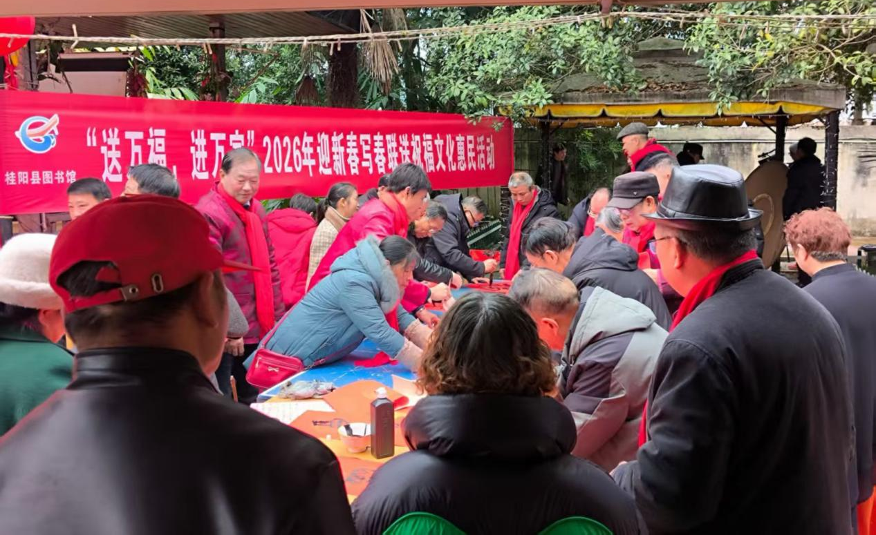 为迎接2026年新春佳节,营造欢乐祥和的节日氛围,弘扬中华优秀传统文化。近日,桂阳县图书馆联合县传统文化促进会,分别在县图书馆文化园新馆、城区古戏台、敖泉镇及正和镇成功举办了“送万福,进万家”迎新春写春联送祝福文化惠民活动。